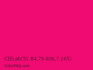 CIELab 51.84,79.606,7.165 Color is a normal rose color and the nearest color is Red Purple #e40078. Hex code #f00b73 and RGB value is rgb(240,11,115). In RGB color space, this color is composed of 94% red, 4% green, 45% blue, In CMYK color space, this color is composed of 0% cyan, 95% magenta, 52% yellow , 6% black , In HSL color space, this color has a hue angle of 333° , 91% saturation and 49% lightness.