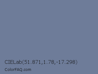 CIELab 51.871,1.78,-17.298 Color is a normal blue color and the nearest color is Lynch #697e9a. Hex code #6e7c99 and RGB value is rgb(110,124,153). In RGB color space, this color is composed of 43% red, 49% green, 60% blue, In CMYK color space, this color is composed of 28% cyan, 19% magenta, 0% yellow , 40% black , In HSL color space, this color has a hue angle of 220° , 17% saturation and 52% lightness.