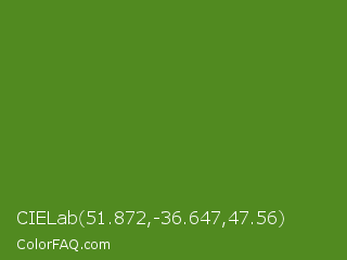 CIELab 51.872,-36.647,47.56 Color is a normal green color and the nearest color is Vida Loca #549019. Hex code #518a20 and RGB value is rgb(81,138,32). In RGB color space, this color is composed of 32% red, 54% green, 13% blue, In CMYK color space, this color is composed of 41% cyan, 0% magenta, 77% yellow , 46% black , In HSL color space, this color has a hue angle of 92° , 62% saturation and 33% lightness.