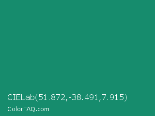 CIELab 51.872,-38.491,7.915 Color is a normal cyan color and the nearest color is Elf Green #088370. Hex code #168c6d and RGB value is rgb(22,140,109). In RGB color space, this color is composed of 9% red, 55% green, 43% blue, In CMYK color space, this color is composed of 84% cyan, 0% magenta, 22% yellow , 45% black , In HSL color space, this color has a hue angle of 164° , 73% saturation and 32% lightness.