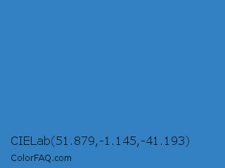 CIELab 51.879,-1.145,-41.193 Color is a normal blue color and the nearest color is Cyan Blue Azure #4682bf. Hex code #3380c2 and RGB value is rgb(51,128,194). In RGB color space, this color is composed of 20% red, 50% green, 76% blue, In CMYK color space, this color is composed of 74% cyan, 34% magenta, 0% yellow , 24% black , In HSL color space, this color has a hue angle of 208° , 58% saturation and 48% lightness.