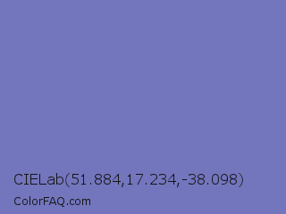 CIELab 51.884,17.234,-38.098 Color is a normal blue color and the nearest color is Toolbox #746cc0. Hex code #7375bd and RGB value is rgb(115,117,189). In RGB color space, this color is composed of 45% red, 46% green, 74% blue, In CMYK color space, this color is composed of 39% cyan, 38% magenta, 0% yellow , 26% black , In HSL color space, this color has a hue angle of 238° , 36% saturation and 60% lightness.