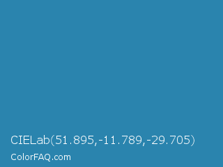 CIELab 51.895,-11.789,-29.705 Color is a normal blue color and the nearest color is Astral #327da0. Hex code #2a84ae and RGB value is rgb(42,132,174). In RGB color space, this color is composed of 16% red, 52% green, 68% blue, In CMYK color space, this color is composed of 76% cyan, 24% magenta, 0% yellow , 32% black , In HSL color space, this color has a hue angle of 199° , 61% saturation and 42% lightness.
