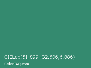 CIELab 51.899,-32.606,6.886 Color is a normal green color and the nearest color is Illuminating Emerald #319177. Hex code #348a6f and RGB value is rgb(52,138,111). In RGB color space, this color is composed of 20% red, 54% green, 44% blue, In CMYK color space, this color is composed of 62% cyan, 0% magenta, 20% yellow , 46% black , In HSL color space, this color has a hue angle of 161° , 45% saturation and 37% lightness.