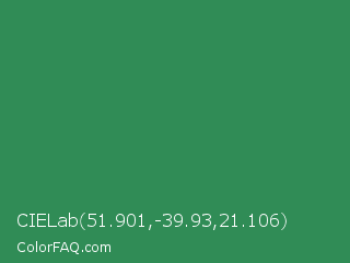 CIELab 51.901,-39.93,21.106 Color is a normal green color and the nearest color is Sea Green #2e8b57. Hex code #308c56 and RGB value is rgb(48,140,86). In RGB color space, this color is composed of 19% red, 55% green, 34% blue, In CMYK color space, this color is composed of 66% cyan, 0% magenta, 39% yellow , 45% black , In HSL color space, this color has a hue angle of 145° , 49% saturation and 37% lightness.