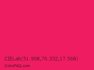 CIELab 51.908,76.332,17.568 Color is a normal rose color and the nearest color is Razzmatazz #e3256b. Hex code #ef1c62 and RGB value is rgb(239,28,98). In RGB color space, this color is composed of 94% red, 11% green, 38% blue, In CMYK color space, this color is composed of 0% cyan, 88% magenta, 59% yellow , 6% black , In HSL color space, this color has a hue angle of 340° , 87% saturation and 52% lightness.