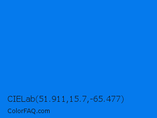 CIELab 51.911,15.7,-65.477 Color is a normal blue color and the nearest color is Azure Radiance #007fff. Hex code #057aed and RGB value is rgb(5,122,237). In RGB color space, this color is composed of 2% red, 48% green, 93% blue, In CMYK color space, this color is composed of 98% cyan, 49% magenta, 0% yellow , 7% black , In HSL color space, this color has a hue angle of 210° , 96% saturation and 47% lightness.