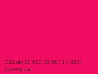 CIELab 51.912,78.867,17.063 Color is a normal rose color and the nearest color is Raspberry #e30b5d. Hex code #f20d63 and RGB value is rgb(242,13,99). In RGB color space, this color is composed of 95% red, 5% green, 39% blue, In CMYK color space, this color is composed of 0% cyan, 95% magenta, 59% yellow , 5% black , In HSL color space, this color has a hue angle of 337° , 90% saturation and 50% lightness.