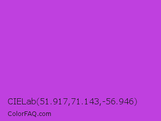 CIELab 51.917,71.143,-56.946 Color is a normal purple color and the nearest color is Medium Orchid #ba55d3. Hex code #bf40df and RGB value is rgb(191,64,223). In RGB color space, this color is composed of 75% red, 25% green, 87% blue, In CMYK color space, this color is composed of 14% cyan, 71% magenta, 0% yellow , 13% black , In HSL color space, this color has a hue angle of 288° , 71% saturation and 56% lightness.