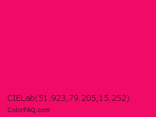 CIELab 51.923,79.205,15.252 Color is a normal rose color and the nearest color is Raspberry #e30b5d. Hex code #f20b66 and RGB value is rgb(242,11,102). In RGB color space, this color is composed of 95% red, 4% green, 40% blue, In CMYK color space, this color is composed of 0% cyan, 95% magenta, 58% yellow , 5% black , In HSL color space, this color has a hue angle of 336° , 91% saturation and 50% lightness.