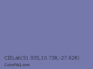 CIELab 51.935,10.738,-27.628 Color is a normal blue color and the nearest color is Kimberly #736c9f. Hex code #7478ab and RGB value is rgb(116,120,171). In RGB color space, this color is composed of 45% red, 47% green, 67% blue, In CMYK color space, this color is composed of 32% cyan, 30% magenta, 0% yellow , 33% black , In HSL color space, this color has a hue angle of 236° , 25% saturation and 56% lightness.