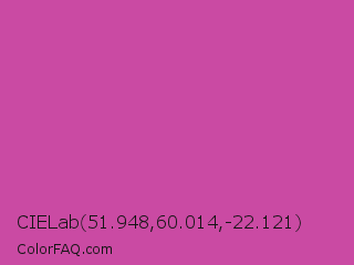CIELab 51.948,60.014,-22.121 Color is a normal magenta color and the nearest color is Pink Pantone #d74894. Hex code #ca4aa3 and RGB value is rgb(202,74,163). In RGB color space, this color is composed of 79% red, 29% green, 64% blue, In CMYK color space, this color is composed of 0% cyan, 63% magenta, 19% yellow , 21% black , In HSL color space, this color has a hue angle of 318° , 55% saturation and 54% lightness.
