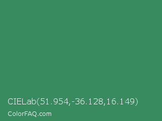 CIELab 51.954,-36.128,16.149 Color is a normal green color and the nearest color is Sea Green #2e8b57. Hex code #378b5f and RGB value is rgb(55,139,95). In RGB color space, this color is composed of 22% red, 55% green, 37% blue, In CMYK color space, this color is composed of 60% cyan, 0% magenta, 32% yellow , 45% black , In HSL color space, this color has a hue angle of 149° , 43% saturation and 38% lightness.