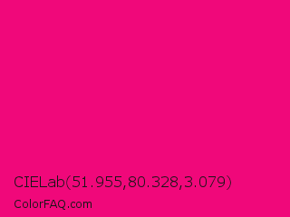 CIELab 51.955,80.328,3.079 Color is a normal rose color and the nearest color is Red Purple #e40078. Hex code #f0087a and RGB value is rgb(240,8,122). In RGB color space, this color is composed of 94% red, 3% green, 48% blue, In CMYK color space, this color is composed of 0% cyan, 97% magenta, 49% yellow , 6% black , In HSL color space, this color has a hue angle of 331° , 94% saturation and 49% lightness.