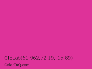 CIELab 51.962,72.19,-15.89 Color is a normal magenta color and the nearest color is Frostbite #e936a7. Hex code #de3299 and RGB value is rgb(222,50,153). In RGB color space, this color is composed of 87% red, 20% green, 60% blue, In CMYK color space, this color is composed of 0% cyan, 77% magenta, 31% yellow , 13% black , In HSL color space, this color has a hue angle of 324° , 72% saturation and 53% lightness.