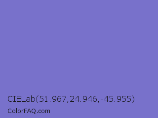 CIELab 51.967,24.946,-45.955 Color is a light indigo color and the nearest color is Moody Blue #7f76d3. Hex code #7871cb and RGB value is rgb(120,113,203). In RGB color space, this color is composed of 47% red, 44% green, 80% blue, In CMYK color space, this color is composed of 41% cyan, 44% magenta, 0% yellow , 20% black , In HSL color space, this color has a hue angle of 245° , 46% saturation and 62% lightness.