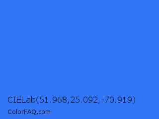 CIELab 51.968,25.092,-70.919 Color is a normal blue color and the nearest color is Blue Crayola #1f75fe. Hex code #3275f7 and RGB value is rgb(50,117,247). In RGB color space, this color is composed of 20% red, 46% green, 97% blue, In CMYK color space, this color is composed of 80% cyan, 53% magenta, 0% yellow , 3% black , In HSL color space, this color has a hue angle of 220° , 92% saturation and 58% lightness.