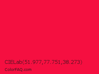 CIELab 51.977,77.751,38.273 Color is a normal red color and the nearest color is Red Ribbon #ed0a3f. Hex code #f50f40 and RGB value is rgb(245,15,64). In RGB color space, this color is composed of 96% red, 6% green, 25% blue, In CMYK color space, this color is composed of 0% cyan, 94% magenta, 74% yellow , 4% black , In HSL color space, this color has a hue angle of 347° , 92% saturation and 51% lightness.