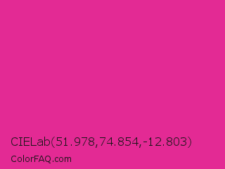 CIELab 51.978,74.854,-12.803 Color is a normal magenta color and the nearest color is Barbie Pink #e0218a. Hex code #e32a94 and RGB value is rgb(227,42,148). In RGB color space, this color is composed of 89% red, 16% green, 58% blue, In CMYK color space, this color is composed of 0% cyan, 81% magenta, 35% yellow , 11% black , In HSL color space, this color has a hue angle of 326° , 77% saturation and 53% lightness.