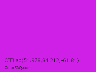 CIELab 51.978,84.212,-61.81 Color is a normal magenta color and the nearest color is Vivid Mulberry #b80ce3. Hex code #cf20e8 and RGB value is rgb(207,32,232). In RGB color space, this color is composed of 81% red, 13% green, 91% blue, In CMYK color space, this color is composed of 11% cyan, 86% magenta, 0% yellow , 9% black , In HSL color space, this color has a hue angle of 293° , 81% saturation and 52% lightness.