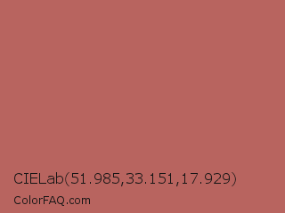 CIELab 51.985,33.151,17.929 Color is a normal red color and the nearest color is Matrix #b05d54. Hex code #b8645f and RGB value is rgb(184,100,95). In RGB color space, this color is composed of 72% red, 39% green, 37% blue, In CMYK color space, this color is composed of 0% cyan, 46% magenta, 48% yellow , 28% black , In HSL color space, this color has a hue angle of 3° , 39% saturation and 55% lightness.