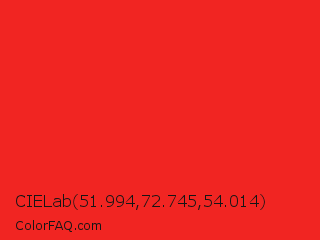 CIELab 51.994,72.745,54.014 Color is a normal red color and the nearest color is Red Pigment #ed1c24. Hex code #f12522 and RGB value is rgb(241,37,34). In RGB color space, this color is composed of 95% red, 15% green, 13% blue, In CMYK color space, this color is composed of 0% cyan, 85% magenta, 86% yellow , 5% black , In HSL color space, this color has a hue angle of 1° , 88% saturation and 54% lightness.