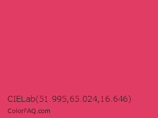 CIELab 51.995,65.024,16.646 Color is a normal red color and the nearest color is Paradise Pink #e63e62. Hex code #e13c63 and RGB value is rgb(225,60,99). In RGB color space, this color is composed of 88% red, 24% green, 39% blue, In CMYK color space, this color is composed of 0% cyan, 73% magenta, 56% yellow , 12% black , In HSL color space, this color has a hue angle of 346° , 73% saturation and 56% lightness.