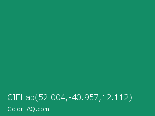 CIELab 52.004,-40.957,12.112 Color is a normal green color and the nearest color is Elf Green #088370. Hex code #138d66 and RGB value is rgb(19,141,102). In RGB color space, this color is composed of 7% red, 55% green, 40% blue, In CMYK color space, this color is composed of 87% cyan, 0% magenta, 28% yellow , 45% black , In HSL color space, this color has a hue angle of 161° , 76% saturation and 31% lightness.