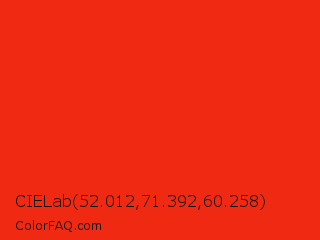 CIELab 52.012,71.392,60.258 Color is a normal red color and the nearest color is Red RYB #fe2712. Hex code #f02912 and RGB value is rgb(240,41,18). In RGB color space, this color is composed of 94% red, 16% green, 7% blue, In CMYK color space, this color is composed of 0% cyan, 83% magenta, 93% yellow , 6% black , In HSL color space, this color has a hue angle of 6° , 88% saturation and 51% lightness.