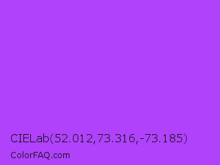 CIELab 52.012,73.316,-73.185 Color is a light purple color and the nearest color is Navy Purple #9457eb. Hex code #b042fc and RGB value is rgb(176,66,252). In RGB color space, this color is composed of 69% red, 26% green, 99% blue, In CMYK color space, this color is composed of 30% cyan, 74% magenta, 0% yellow , 1% black , In HSL color space, this color has a hue angle of 275° , 97% saturation and 62% lightness.