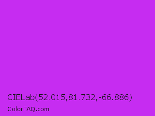 CIELab 52.015,81.732,-66.886 Color is a normal purple color and the nearest color is Vivid Mulberry #b80ce3. Hex code #c62cf1 and RGB value is rgb(198,44,241). In RGB color space, this color is composed of 78% red, 17% green, 95% blue, In CMYK color space, this color is composed of 18% cyan, 82% magenta, 0% yellow , 5% black , In HSL color space, this color has a hue angle of 287° , 88% saturation and 56% lightness.