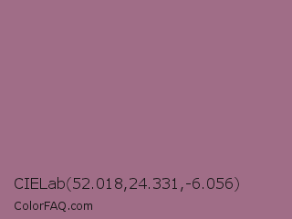 CIELab 52.018,24.331,-6.056 Color is a normal rose color and the nearest color is Strikemaster #956387. Hex code #a06d87 and RGB value is rgb(160,109,135). In RGB color space, this color is composed of 63% red, 43% green, 53% blue, In CMYK color space, this color is composed of 0% cyan, 32% magenta, 16% yellow , 37% black , In HSL color space, this color has a hue angle of 329° , 21% saturation and 53% lightness.