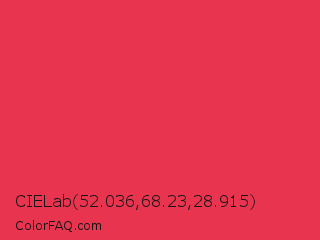 CIELab 52.036,68.23,28.915 Color is a normal red color and the nearest color is Desire #ea3c53. Hex code #e8344f and RGB value is rgb(232,52,79). In RGB color space, this color is composed of 91% red, 20% green, 31% blue, In CMYK color space, this color is composed of 0% cyan, 78% magenta, 66% yellow , 9% black , In HSL color space, this color has a hue angle of 351° , 80% saturation and 56% lightness.