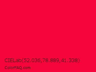 CIELab 52.036,78.889,41.338 Color is a normal red color and the nearest color is Red Munsell #f2003c. Hex code #f7043b and RGB value is rgb(247,4,59). In RGB color space, this color is composed of 97% red, 2% green, 23% blue, In CMYK color space, this color is composed of 0% cyan, 98% magenta, 76% yellow , 3% black , In HSL color space, this color has a hue angle of 346° , 97% saturation and 49% lightness.