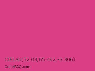 CIELab 52.03,65.492,-3.306 Color is a normal rose color and the nearest color is Cerise #da3287. Hex code #db3e84 and RGB value is rgb(219,62,132). In RGB color space, this color is composed of 86% red, 24% green, 52% blue, In CMYK color space, this color is composed of 0% cyan, 72% magenta, 40% yellow , 14% black , In HSL color space, this color has a hue angle of 333° , 69% saturation and 55% lightness.