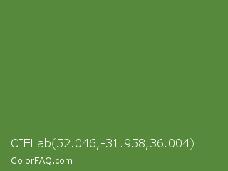 CIELab 52.046,-31.958,36.004 Color is a normal green color and the nearest color is Maximum Green #5e8c31. Hex code #56893b and RGB value is rgb(86,137,59). In RGB color space, this color is composed of 34% red, 54% green, 23% blue, In CMYK color space, this color is composed of 37% cyan, 0% magenta, 57% yellow , 46% black , In HSL color space, this color has a hue angle of 99° , 40% saturation and 38% lightness.