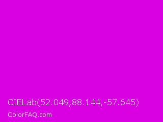 CIELab 52.049,88.144,-57.645 Color is a normal magenta color and the nearest color is Deep Magenta #cc00cc. Hex code #d900e1 and RGB value is rgb(217,0,225). In RGB color space, this color is composed of 85% red, 0% green, 88% blue, In CMYK color space, this color is composed of 4% cyan, 100% magenta, 0% yellow , 12% black , In HSL color space, this color has a hue angle of 298° , 100% saturation and 44% lightness.