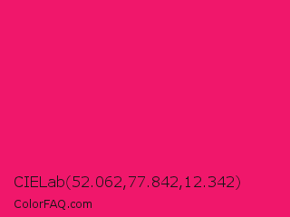 CIELab 52.062,77.842,12.342 Color is a normal rose color and the nearest color is Razzmatazz #e3256b. Hex code #f0176b and RGB value is rgb(240,23,107). In RGB color space, this color is composed of 94% red, 9% green, 42% blue, In CMYK color space, this color is composed of 0% cyan, 90% magenta, 55% yellow , 6% black , In HSL color space, this color has a hue angle of 337° , 88% saturation and 52% lightness.
