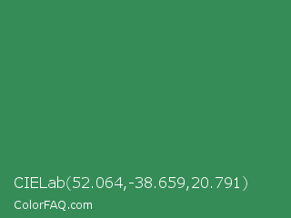 CIELab 52.064,-38.659,20.791 Color is a normal green color and the nearest color is Sea Green #2e8b57. Hex code #358c57 and RGB value is rgb(53,140,87). In RGB color space, this color is composed of 21% red, 55% green, 34% blue, In CMYK color space, this color is composed of 62% cyan, 0% magenta, 38% yellow , 45% black , In HSL color space, this color has a hue angle of 143° , 45% saturation and 38% lightness.