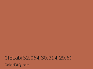 CIELab 52.064,30.314,29.6 Color is a normal color and the nearest color is Santa Fe #b16d52. Hex code #b8664b and RGB value is rgb(184,102,75). In RGB color space, this color is composed of 72% red, 40% green, 29% blue, In CMYK color space, this color is composed of 0% cyan, 45% magenta, 59% yellow , 28% black , In HSL color space, this color has a hue angle of 15° , 43% saturation and 51% lightness.