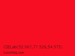 CIELab 52.067,77.529,54.575 Color is a normal red color and the nearest color is Vivid Red #f70d1a. Hex code #f70e22 and RGB value is rgb(247,14,34). In RGB color space, this color is composed of 97% red, 5% green, 13% blue, In CMYK color space, this color is composed of 0% cyan, 94% magenta, 86% yellow , 3% black , In HSL color space, this color has a hue angle of 355° , 94% saturation and 51% lightness.