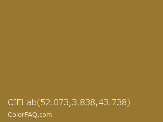 CIELab 52.073,3.838,43.738 Color is a normal orange color and the nearest color is Metallic Sunburst #9c7c38. Hex code #97782e and RGB value is rgb(151,120,46). In RGB color space, this color is composed of 59% red, 47% green, 18% blue, In CMYK color space, this color is composed of 0% cyan, 21% magenta, 70% yellow , 41% black , In HSL color space, this color has a hue angle of 42° , 53% saturation and 39% lightness.