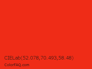 CIELab 52.078,70.493,58.48 Color is a normal red color and the nearest color is Red RYB #fe2712. Hex code #ef2c17 and RGB value is rgb(239,44,23). In RGB color space, this color is composed of 94% red, 17% green, 9% blue, In CMYK color space, this color is composed of 0% cyan, 82% magenta, 90% yellow , 6% black , In HSL color space, this color has a hue angle of 6° , 87% saturation and 51% lightness.