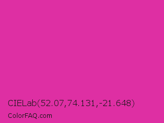 CIELab 52.07,74.131,-21.648 Color is a normal magenta color and the nearest color is Frostbite #e936a7. Hex code #de2fa3 and RGB value is rgb(222,47,163). In RGB color space, this color is composed of 87% red, 18% green, 64% blue, In CMYK color space, this color is composed of 0% cyan, 79% magenta, 27% yellow , 13% black , In HSL color space, this color has a hue angle of 320° , 73% saturation and 53% lightness.