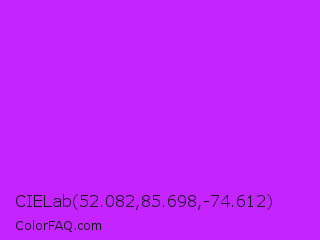 CIELab 52.082,85.698,-74.612 Color is a normal purple color and the nearest color is Electric Purple #bf00ff. Hex code #c424ff and RGB value is rgb(196,36,255). In RGB color space, this color is composed of 77% red, 14% green, 100% blue, In CMYK color space, this color is composed of 23% cyan, 86% magenta, 0% yellow , 0% black , In HSL color space, this color has a hue angle of 284° , 100% saturation and 57% lightness.
