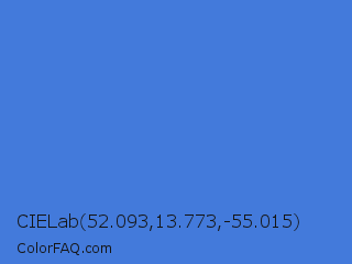 CIELab 52.093,13.773,-55.015 Color is a normal blue color and the nearest color is Royal Blue #4169e1. Hex code #437adb and RGB value is rgb(67,122,219). In RGB color space, this color is composed of 26% red, 48% green, 86% blue, In CMYK color space, this color is composed of 69% cyan, 44% magenta, 0% yellow , 14% black , In HSL color space, this color has a hue angle of 218° , 68% saturation and 56% lightness.