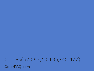 CIELab 52.097,10.135,-46.477 Color is a normal blue color and the nearest color is Cyan Blue Azure #4682bf. Hex code #507bcc and RGB value is rgb(80,123,204). In RGB color space, this color is composed of 31% red, 48% green, 80% blue, In CMYK color space, this color is composed of 61% cyan, 40% magenta, 0% yellow , 20% black , In HSL color space, this color has a hue angle of 219° , 55% saturation and 56% lightness.