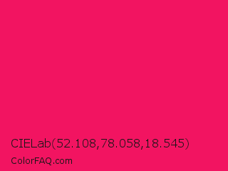 CIELab 52.108,78.058,18.545 Color is a normal rose color and the nearest color is Raspberry #e30b5d. Hex code #f21461 and RGB value is rgb(242,20,97). In RGB color space, this color is composed of 95% red, 8% green, 38% blue, In CMYK color space, this color is composed of 0% cyan, 92% magenta, 60% yellow , 5% black , In HSL color space, this color has a hue angle of 339° , 90% saturation and 51% lightness.