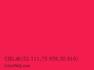 CIELab 52.111,75.959,30.616 Color is a normal red color and the nearest color is Red Crayola #ee204d. Hex code #f21c4d and RGB value is rgb(242,28,77). In RGB color space, this color is composed of 95% red, 11% green, 30% blue, In CMYK color space, this color is composed of 0% cyan, 88% magenta, 68% yellow , 5% black , In HSL color space, this color has a hue angle of 346° , 89% saturation and 53% lightness.