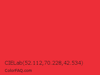 CIELab 52.112,70.228,42.534 Color is a normal red color and the nearest color is Deep Carmine Pink #ef3038. Hex code #ed2e38 and RGB value is rgb(237,46,56). In RGB color space, this color is composed of 93% red, 18% green, 22% blue, In CMYK color space, this color is composed of 0% cyan, 81% magenta, 76% yellow , 7% black , In HSL color space, this color has a hue angle of 357° , 84% saturation and 55% lightness.